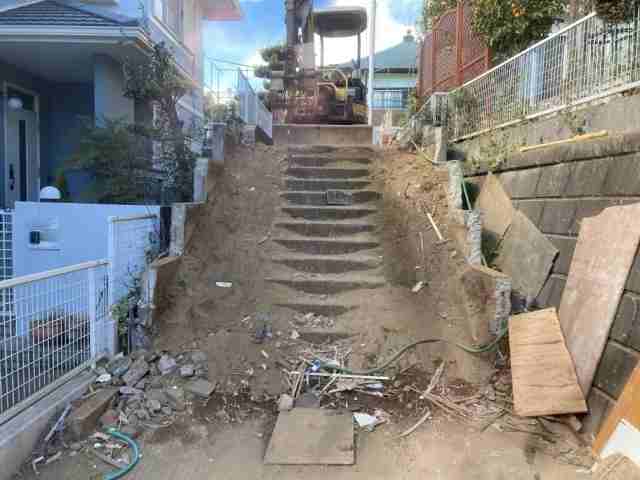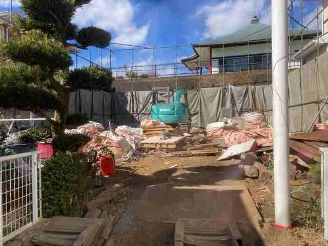 | 工事内容 | 躯体解体工事 基礎解体工事 土間 樹木 コンクリートブロック シート養生・室外残置物撤去処分・物置撤去処分・階段撤去処分・アスベスト事前調査・残置物撤去処分 |