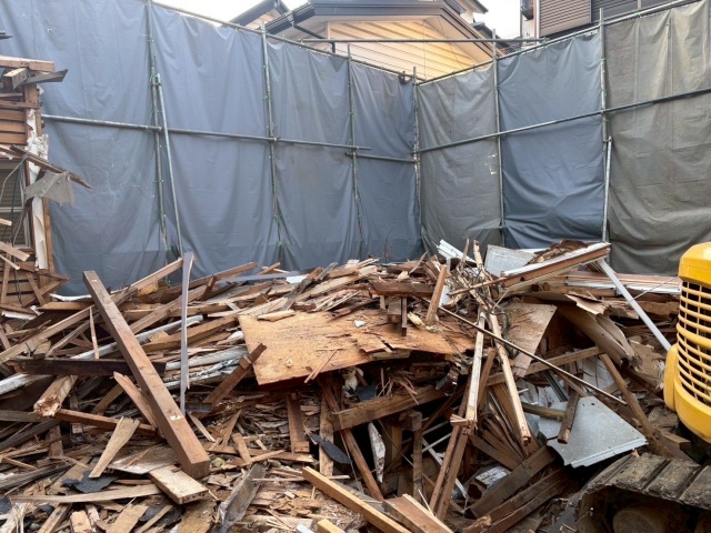| 工事内容 | シート養生・躯体解体工事(重機)・基礎撤去工事・土間撤去処分・駐車場土間撤去処分・玄関タイル土間撤去処分・CB撤去処分・樹木撤去処分・庭石撤去処分・アルミ階段ベランダ階段・屋外残置物撤去処分・アスベスト検体採取 |