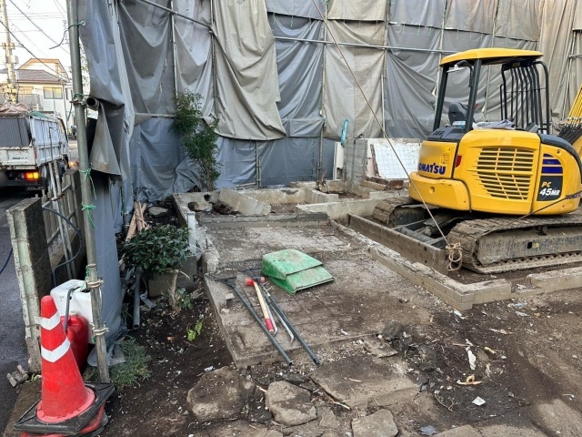| 工事内容 | シート養生・躯体解体工事・基礎撤去工事・土間撤去処分・CB撤去処分・樹木撤去処分・敷石撤去処分・アスベスト事前調査 |