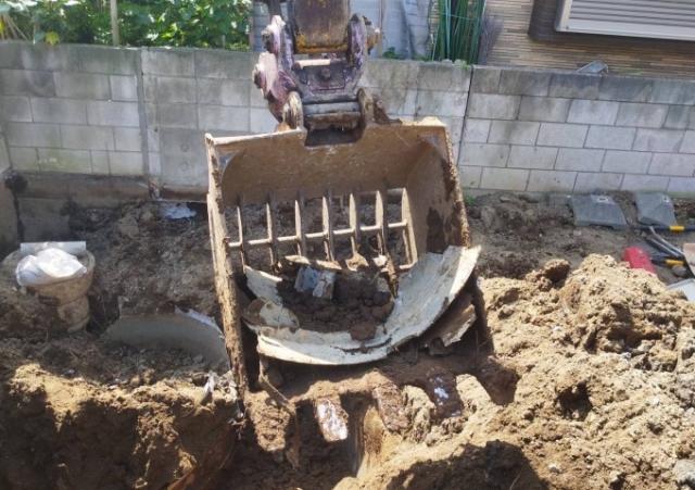 地中からFRPの浄化槽が出てきました。 すぐにお施主様にご連絡し追加費用のご了承をいただき撤去いたしました。 |