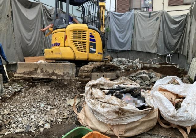 | 工事内容 | 躯体解体工事 基礎解体工事 樹木 コンクリートブロック シート養生・埋設水道管撤去処分・アスベスト事前調査・新設ブロック積み・アルミフェンス設置・取り合い部分処理 |