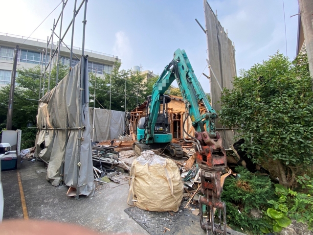 | 工事内容 | 基礎解体工事 土間 樹木 シート養生・躯体解体工事(重機)・庭石撤去処分・アスベスト検体調査 |