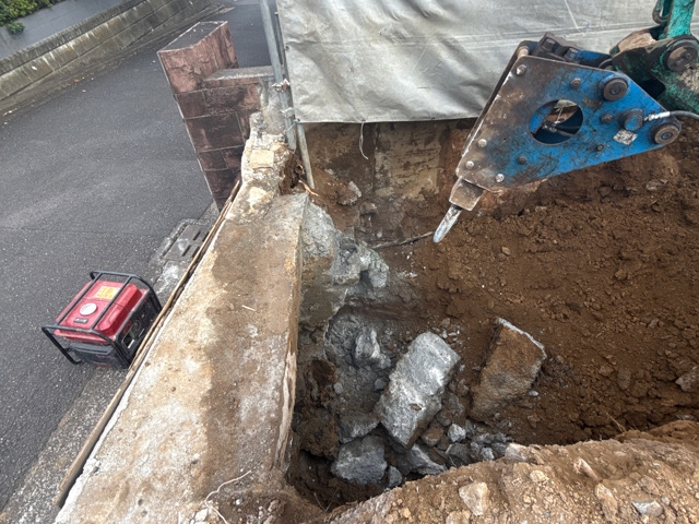 残しとしていた本地擁壁と隣地擁壁に影響しない様に大割で慎重にかみ砕いて進めていき、