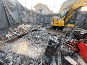 基礎がベタ基礎で配筋も入っており厚い基礎でした。 ブレーカーを使い少しづつ解体していき4週間で完了致しました。 |
