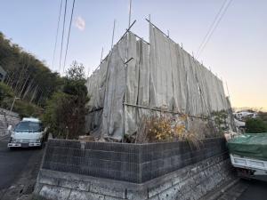 基礎解体工事 土間 樹木 コンクリートブロック シート養生・躯体解体工事(重機)・庭石撤去処分・アスベスト検体調査