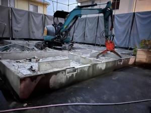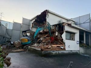 | 工事内容 | 基礎解体工事 土間 樹木 コンクリートブロック シート養生・躯体解体工事(重機)・玄関タイル土間撤去処分・化粧CB撤去処分・庭石撤去処分・玉石擁壁撤去処分・アスベスト検体採取・検体調査 |
