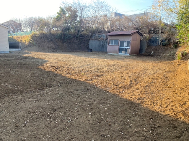 | 工事内容 | 基礎解体工事 土間 コンクリートブロック シート養生・躯体解体工事(重機)・門扉撤去処分・竹林撤去処分・敷石撤去処分・庭石撤去処分・小屋解体工事・アスベスト分析・残置物回収 |