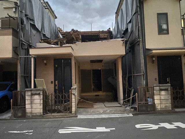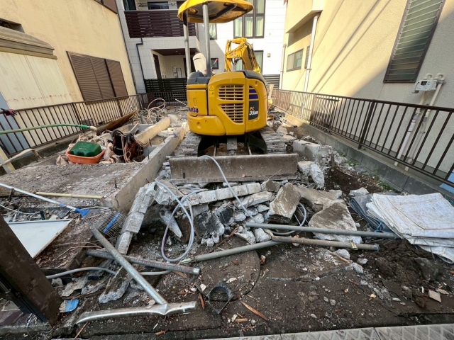 | 工事内容 | 基礎解体工事 土間 コンクリートブロック シート養生・躯体解体工事(重機)・アスベスト事前調査 |