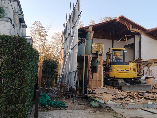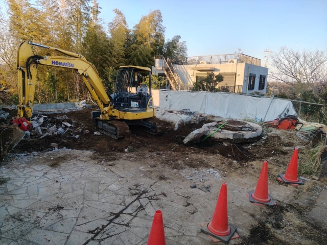 内装解体を終え直ぐに重機入れを行い、 当初は私道に4t車を駐車して廃材を積載していた為、 近隣の皆様には解体期間中大変ご迷惑をお掛けいたしました。