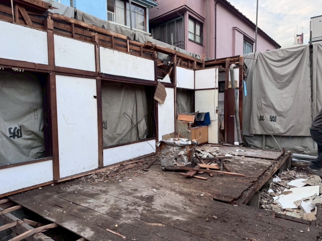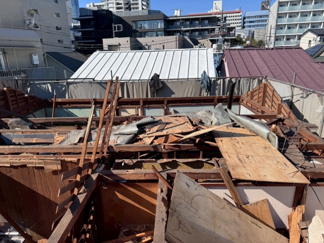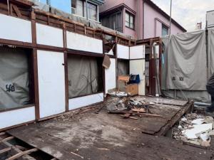 | 工事内容 | シート養生・躯体解体工事・基礎撤去工事・土間撤去処分・CB撤去処分・アスベスト検体検査・がれき・ゴミ埋設物撤去処分 |
